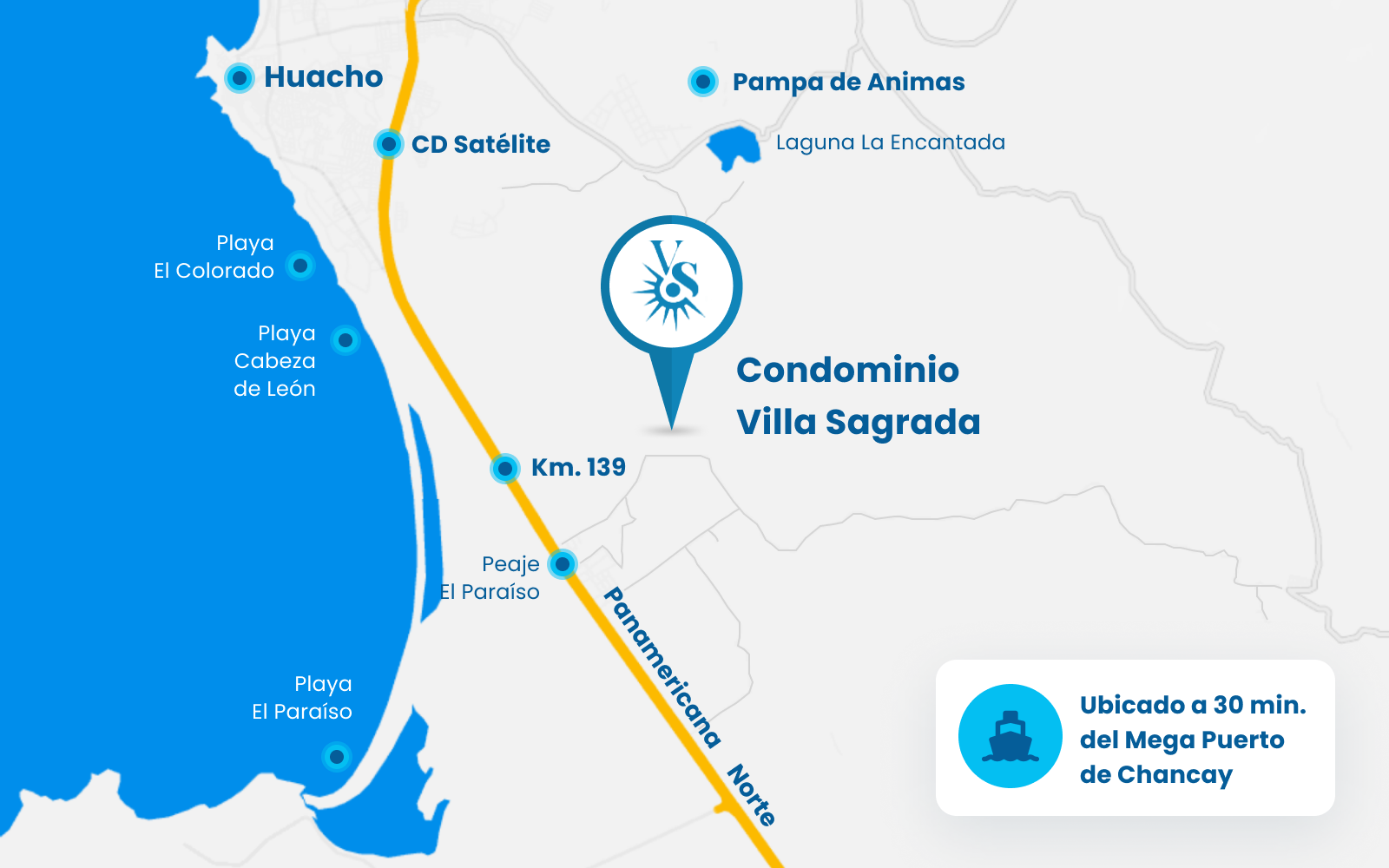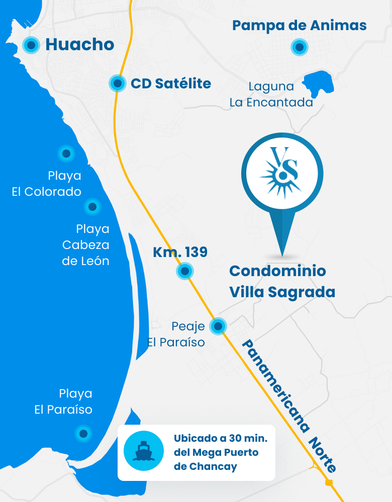 Villa Sagrada se ubica en el Km 139 de la Panamericana Norte, en “El Paraíso” – Huacho. Cerca de playas, zonas turísticas y servicios principales del norte chico.